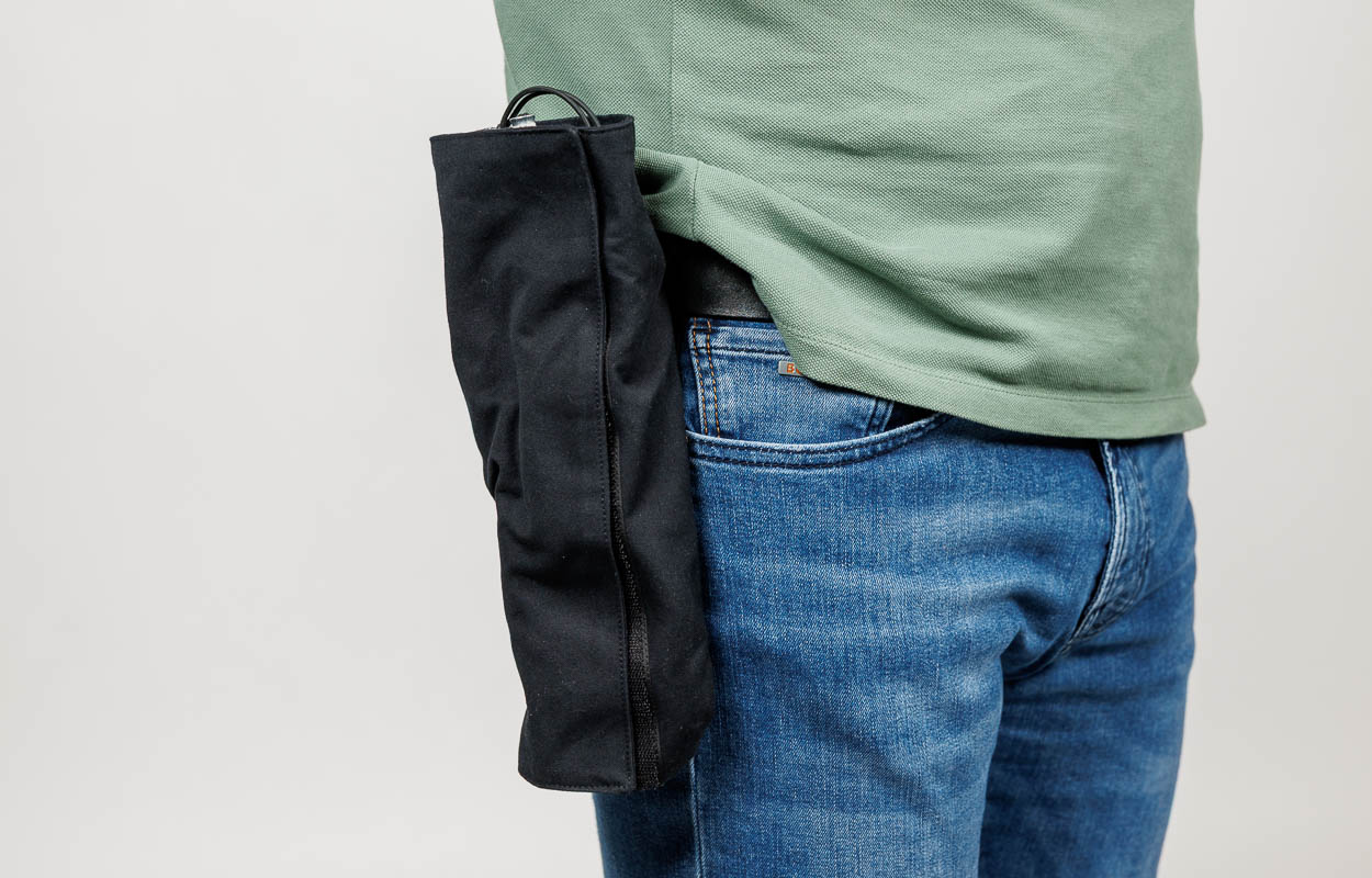 Der faltbare Langstock kann in die Tasche verstaut und mit Klett fixiert werden .